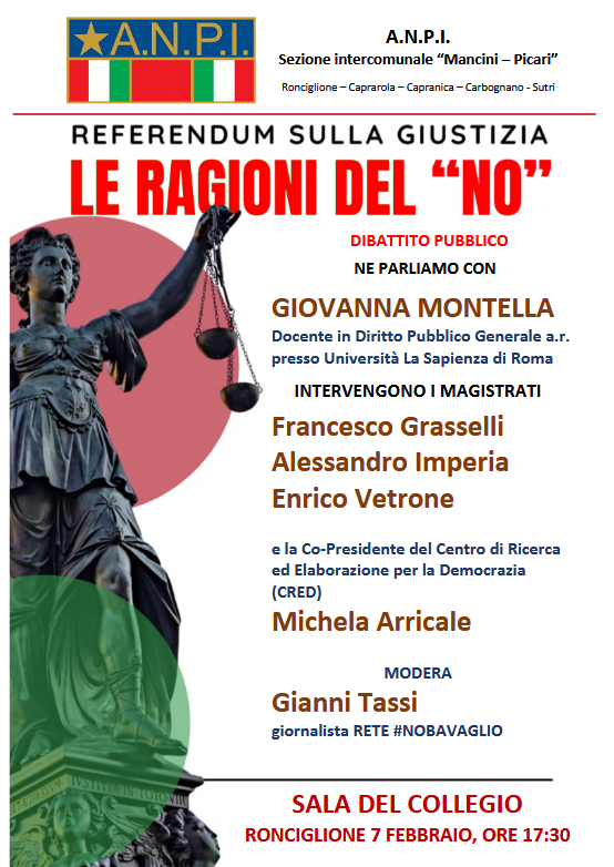 Su questi temi si concentrerà l’incontro pubblico “Referendum sulla Giustizia: le ragioni del No”, organizzato dalla sezione intercomunale ANPI “Mancini Picari”, in programma sabato 7 febbraio alle ore 17.30 presso la Sala del Collegio di Ronciglione. L’iniziativa nasce con l’obiettivo di offrire alla cittadinanza un’occasione di approfondimento e confronto sui quesiti referendari, provando a ricondurre il dibattito al merito delle scelte e alle loro conseguenze sul sistema democratico, al di là degli slogan.